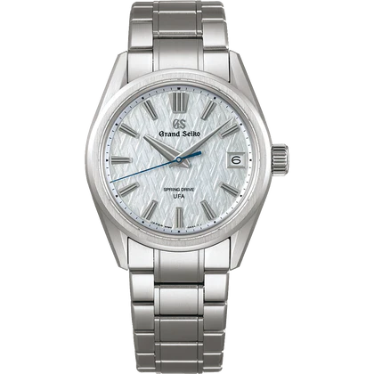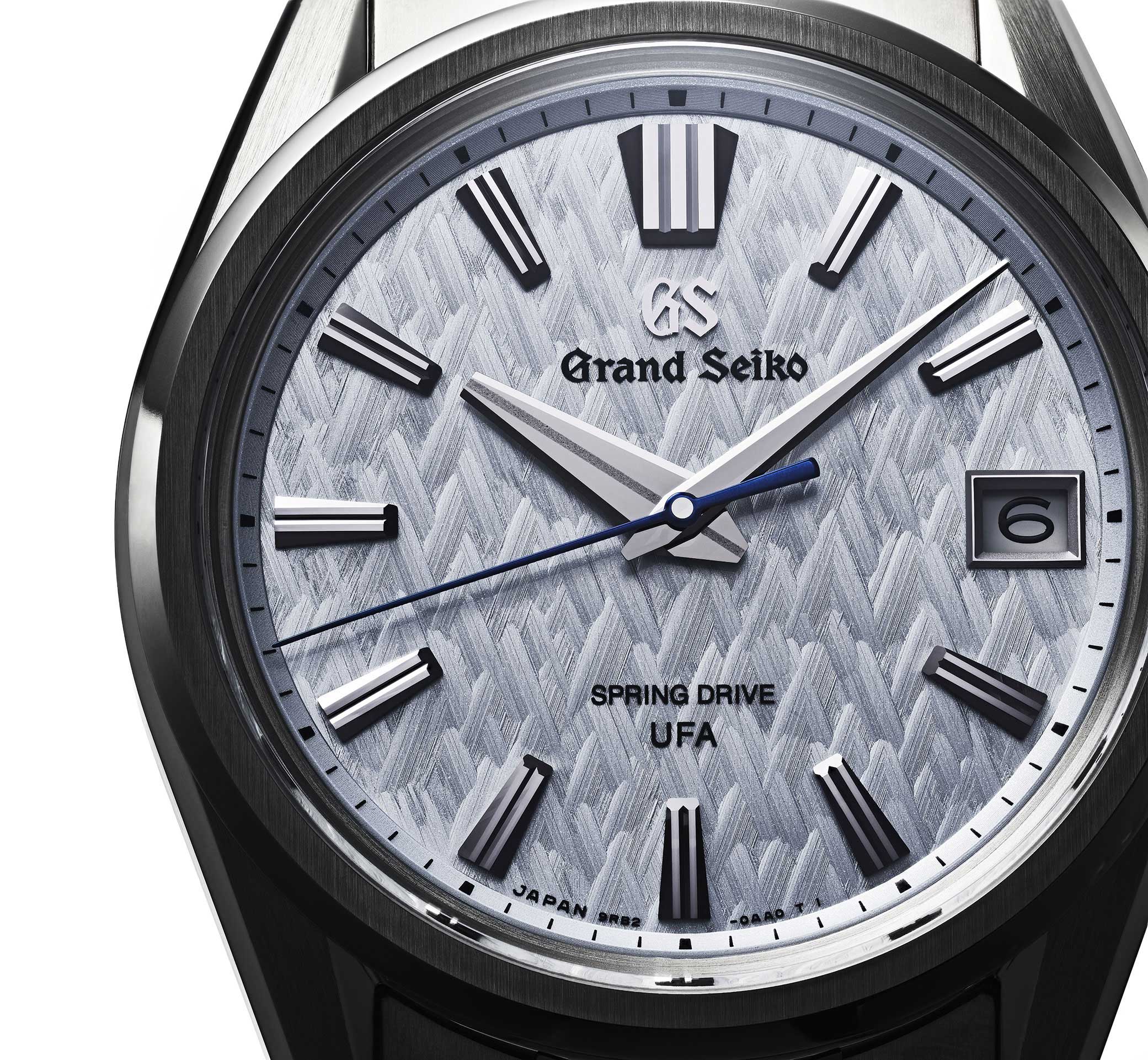 This model is the very first to be equipped with the new movement and bears the inscription “SPRING DRIVE UFA” at the six o’clock position. The shimmering, pearlescent dial features a new pressed pattern inspired by the frost-covered trees seen in the harsh winters of Japan’s Shinshu region.